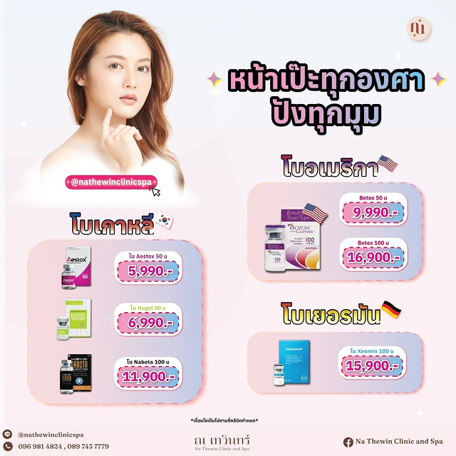 - โบท็อกสัญชาติเยอรมัน โมเลกุลเล็กเมื่อเทียบกับยี่ห้ออื่น ๆ โอกาสดื้อโบท็อกน้อยสุด ผลลัพธ์หลังฉีดได้นาน 4 - 6 เดือน