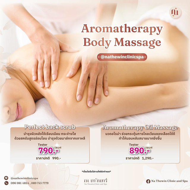 Aromatherapy body massage - นวดตัวอโรม่า บำรุงผิวด้วย Botanical essential blend ผ่อนคลายความเครียด และความตึงของกล้ามเนื้อ ช่วยกระตุ้นการไหลเวียนของเลือด ลดบวม ลดเซลลูไลท์
